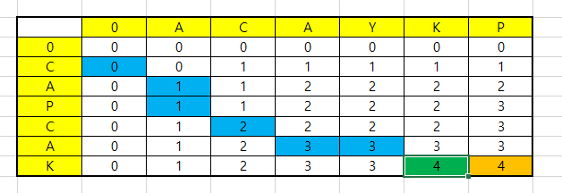 위와 똑같은 행위를 문자 비교없이 테이블의 값만으로 수행할 수가 있다. 주황색 셀이 좌측과 윗쪽의 값을 봤더니 4가 존재한다. 이는 주황색 셀은 {C,A,P,C,A,K} 와 {A,C,A,Y,K}에서 {C,A,P,C,A,K} 와 {A,C,A,Y,K,P} 로 P를 하나 추가한것에 불과하다는 뜻이다. LCS 길이에 변화를 줄 문자가 아니다라는뜻.