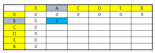 위 테이블에서 파란색 셀의 0이 의미하는것은 {B} 와 {A}의 LCS의 길이이다.( = 0)